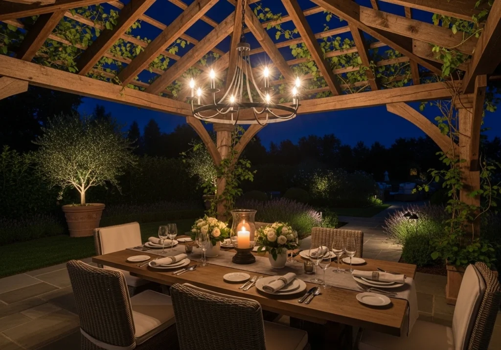 Want drama? A weather-resistant outdoor chandelier can turn your pergola into a dining oasis, blending elegance with functionality.