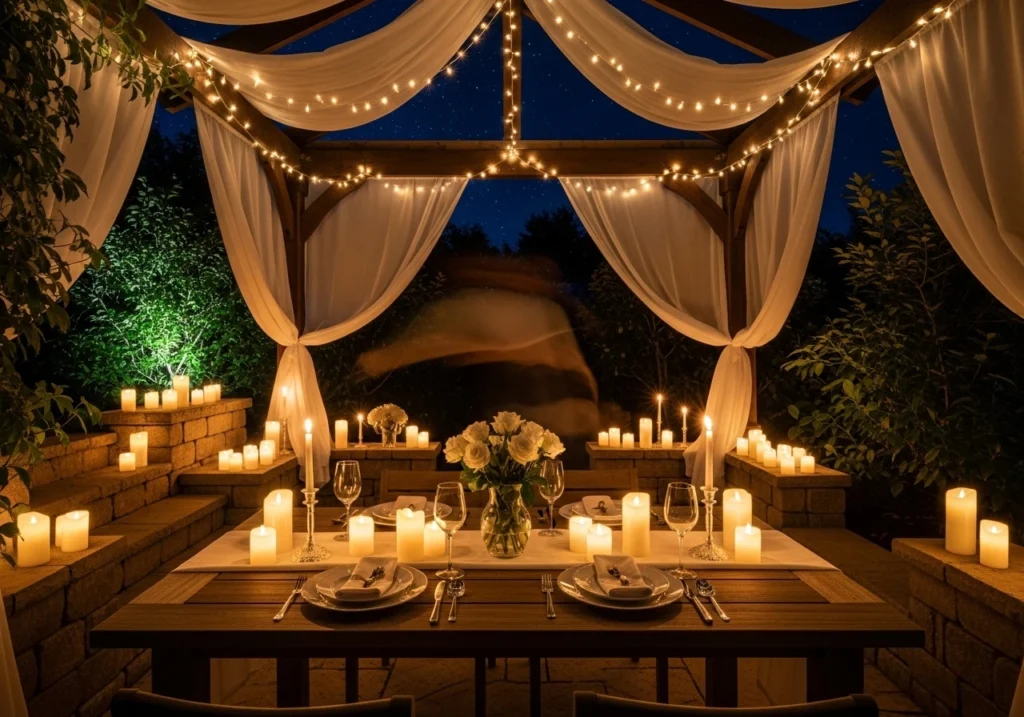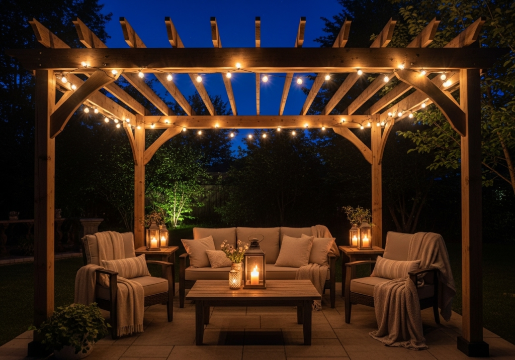 For a romantic vibe, scatter candles or LED flameless candles around your pergola. They’re safe, cozy, and perfect for intimate backyard evenings.