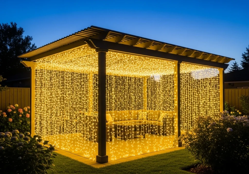 Hang curtain-style string lights along the sides of your pergola. They double as privacy screens and create a sparkling backdrop for parties or quiet nights.
