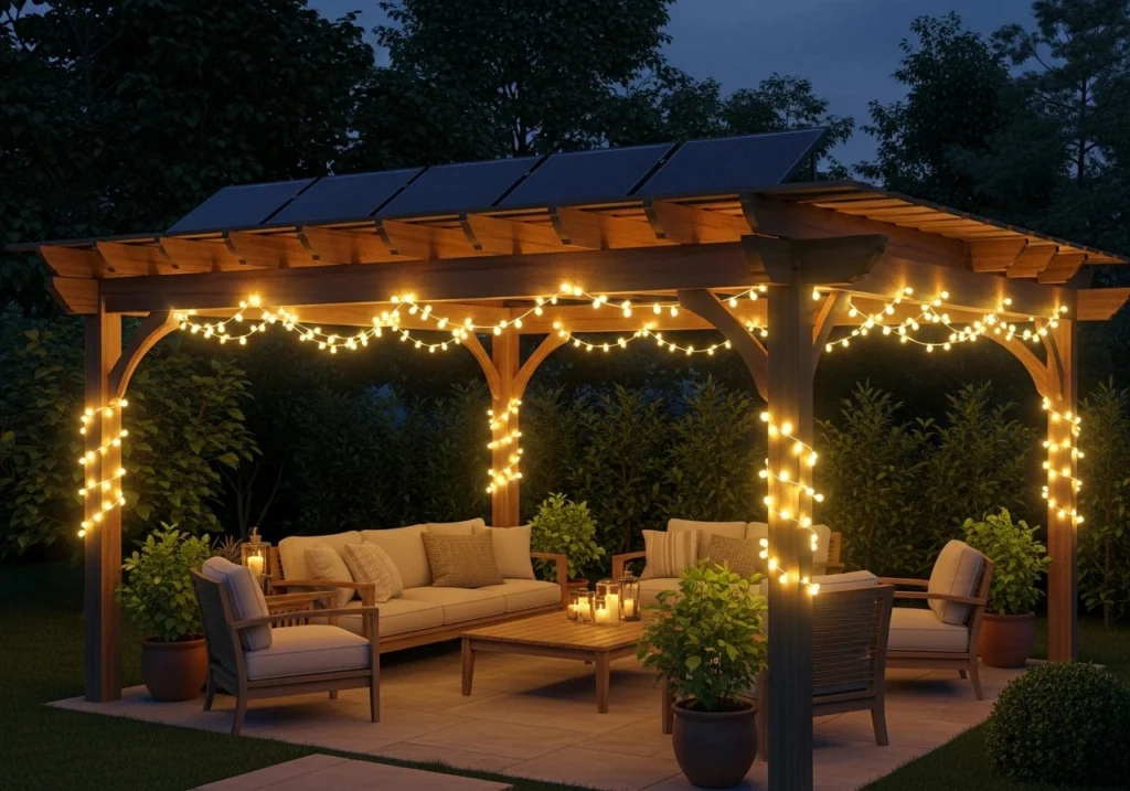 Eco-friendly and cost-saving, solar lights charge during the day and glow all night. They’re a great option for outdoor pergola lighting ideas with low maintenance.